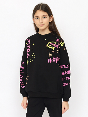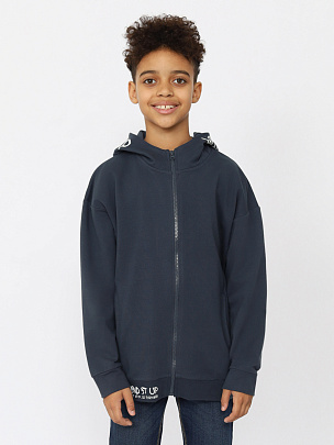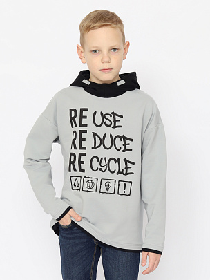 Толстовка с длинными рукавами, притачным поясом и манжетами. Манжеты выполнены из полотна с добавлением лайкры, пояс выполнен из основного полотна. Капюшон со шнурком и подкладкой, верхняя часть декорирована вязаной нашивкой. Перед декорирован принтом "Катайся каждый день".