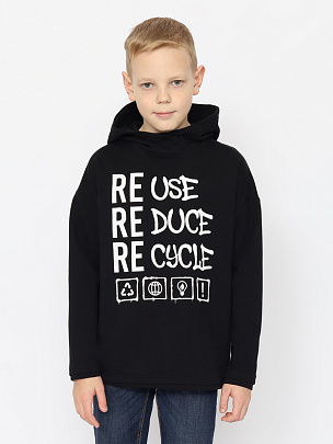 Толстовка с центральной застежкой, длинными рукавами, притачным поясом и манжетами. Манжеты выполнены из полотна с добавлением лайкры, пояс выполнен из основного полотна. Капюшон со шнурком и подкладкой контрастного цвета. Пояс декорирован вязаной нашивкой. Спина декорирована принтом "Скейтерам суждено кататься".