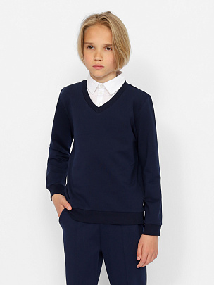 Джемпер с длинным втачным рукавом и манжетами. Манжеты, воротник и пояс выполнены из полотна с добавлением эластана. В горловине расположена эмитация рубашки с отложным воротником и стойкой.