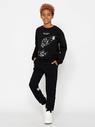 Джемпер с длинными втачными рукавами и притачными манжетами. Воротник, манжеты и пояс выполнены из полотна с эластаном. Перед декорирован принтом "Виртуальный мир без границ".