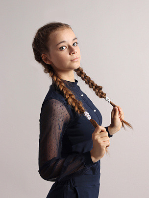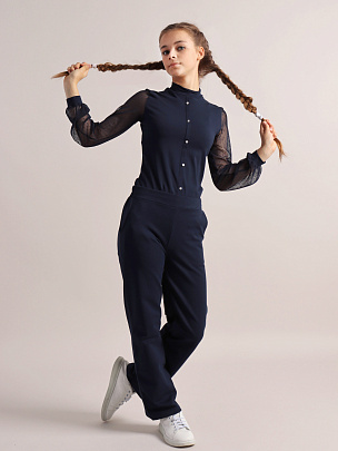 Водолазка для девочки с длинными рукавами и воротником-стойкой. Рукава из сетки с манжетами из кулирки. Полочка с имитацией застежки на пуговицы.