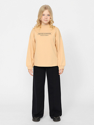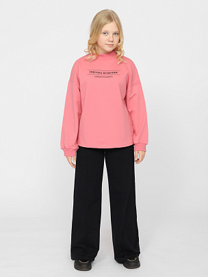 Джемпер для девочки с модным принтом на спинке и нашивкой на рукаве (надпись: "Улыбнись. Настоящий друг всегда в твоем сердце"). Крой оверсайз с заниженной линией плеча, не сковывает движения, позволяя ребенку быть активным. Модель дополнена круглым вырезом горловины и длинными рукавами. Воротник и манжеты выполнены из полотна с эластаном. В боковых швах по низу изделия разрезы.