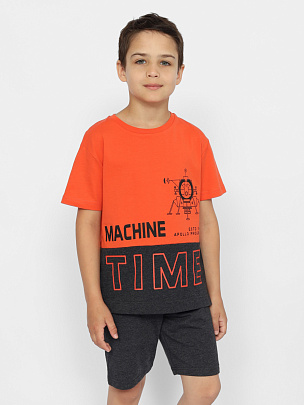 Футболка для мальчика с контрастными вставками по плечам и рукавам. Вставки декорированы принтом. Горловина круглая, обработана узким воротником из полотна с эластаном. Перед футболки декорирован принтом "гонки".